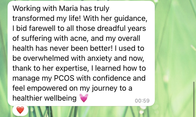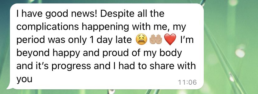 Throughout my journey, I received a lot of personalized support and I learned how to nourish my body with healthy lifestyle habits that support hormonal balance without feeling restricted. I also received emotional support and guidance to help me overcome limiting beliefs and self-doubt.