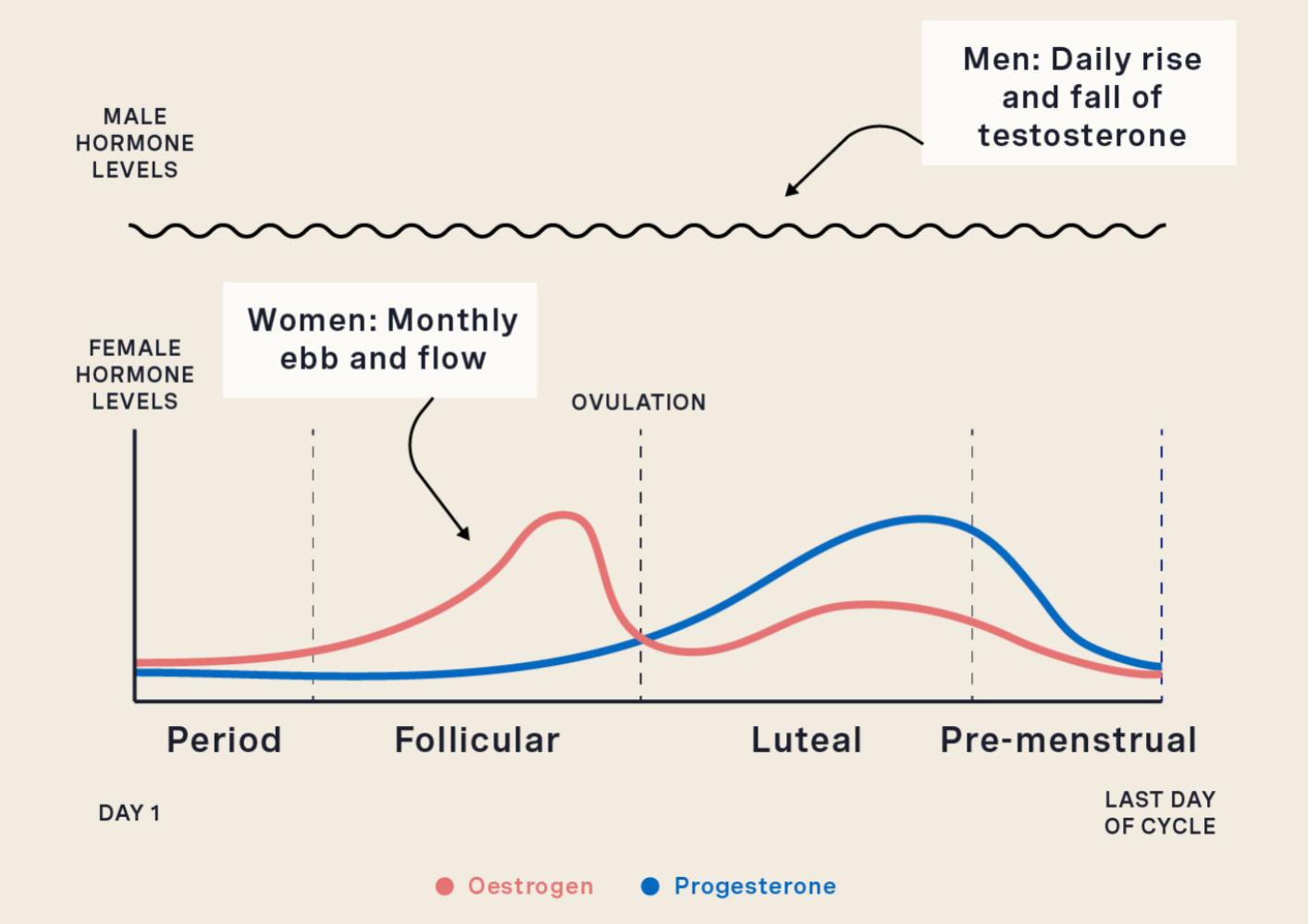 The female-hormonal cycle (aka your menstrual cycle) is run on a 28-day cycle where many hormones are doing a beautiful dance of ups and downs so you can have a regular and symptom free cycle. Just look at the difference below. It's wild the difference between sexes.