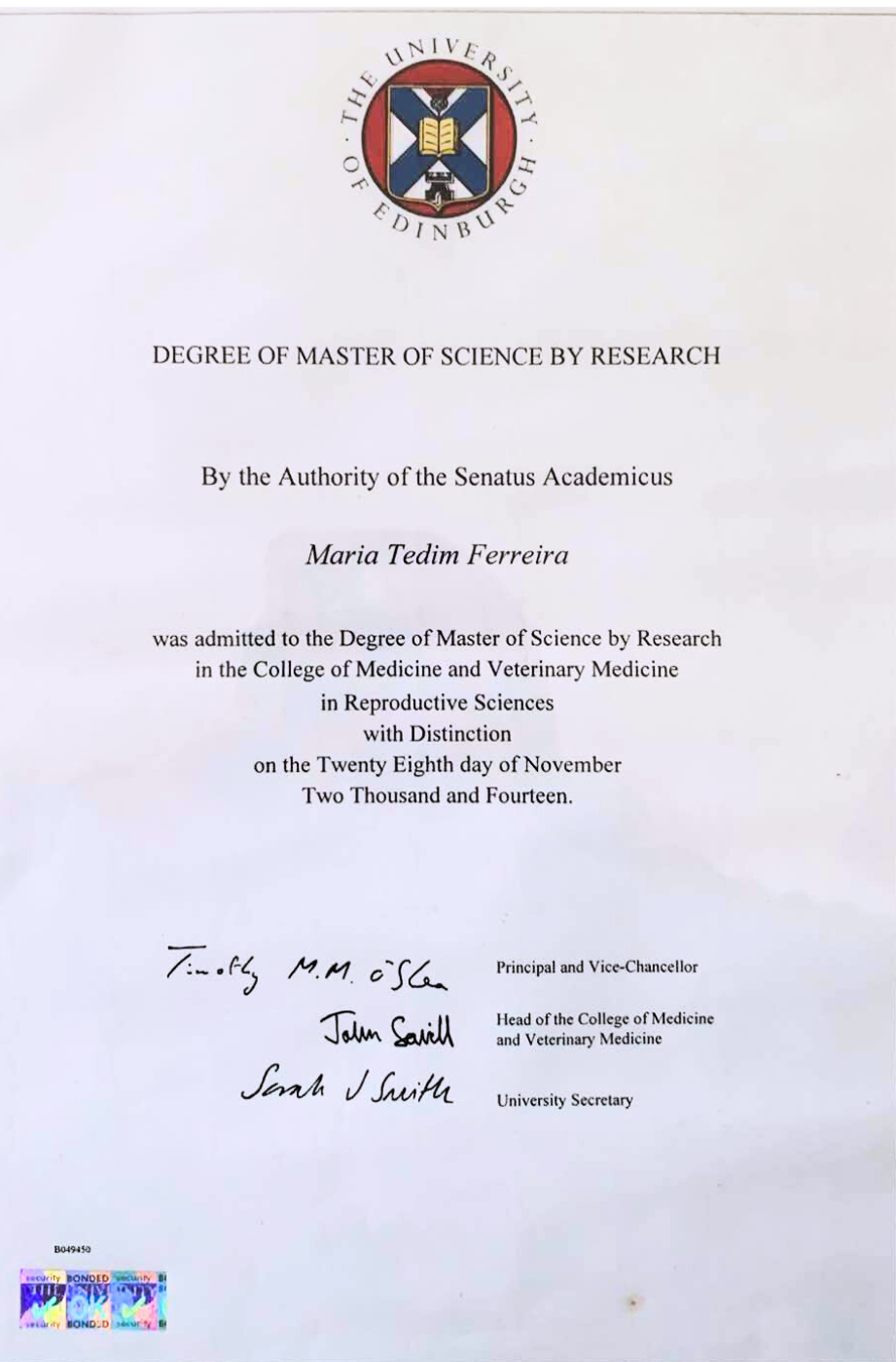 ● Mestrado de Investigação em Ciências Reprodutivas, University of Edinburgh, 2013-2014